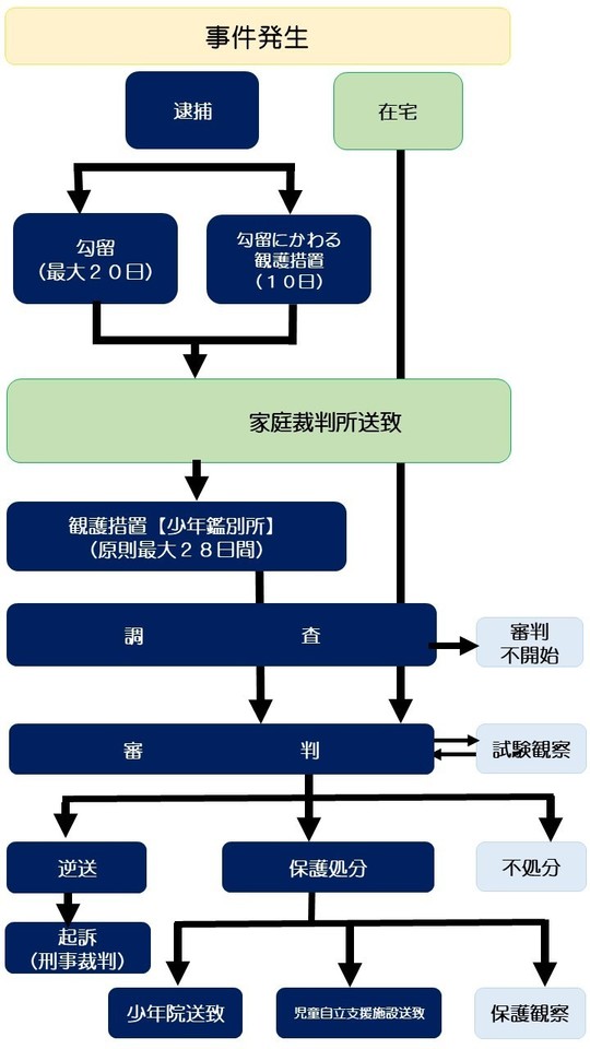 少年事件の手続きの流れと説明は以下をご参照くださいませ。