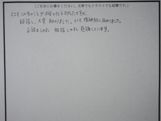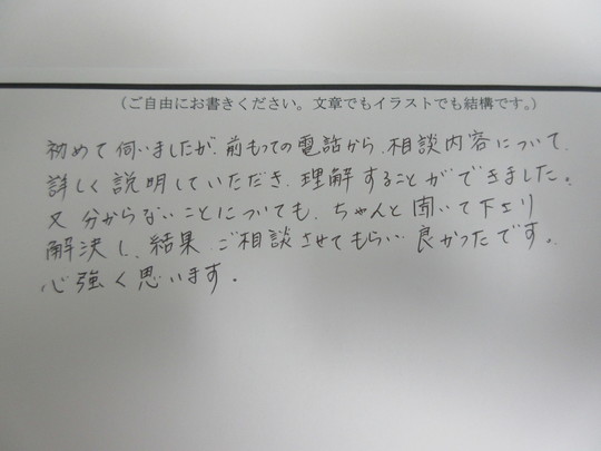 初めて伺いましたが,前もっての電話から相談内容について詳しく説明していただき,理解することができました。又,分からないことについても,ちゃんと聞いて下さり解決し,結果,ご相談させてもらい良かったです。心強く思います。